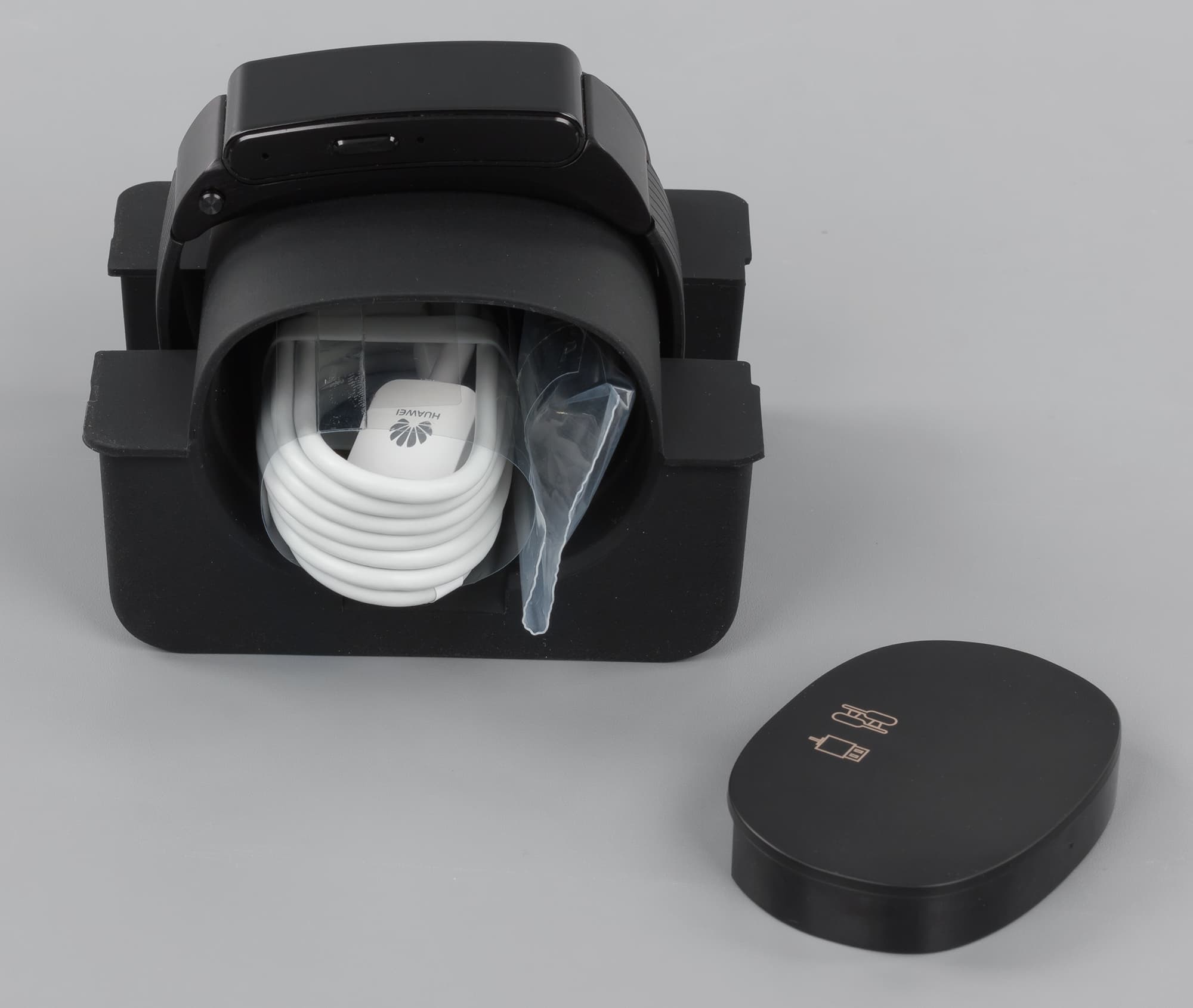 Открыв коробку, мы видим сам браслет, ремешок которого обхватывает резиновый держатель. При этом внутри держателя спрятаны кабель Micro-USB и запасные ушные насадки для гарнитуры.