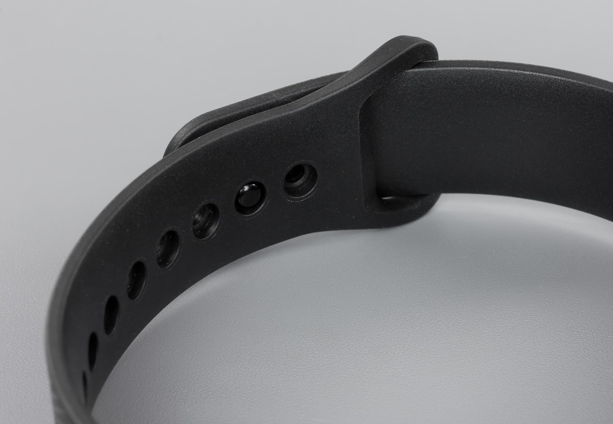 Ремешок — силиконовый, черный (в той версии, что была у нас), довольно тонкий и мягкий, с красивым изящным узором на внешней поверхности. Обе половинки отстегиваются от устройства. Вероятно, если в продаже появятся другие варианты ремешка, которые можно будет купить без устройства, то эта особенность может быть вполне востребована.