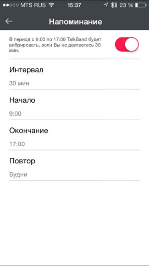 Возможно, это связано с тем, что браслет улавливает движения не только самого обладателя браслета, но и того человека, который спит с ним вместе. Если это так, то тогда необходимо усовершенствовать алгоритм обработки информации от акселерометра, чтобы программа могла различать эти вещи и правильно их трактовать. Из-за недостаточно точной фиксации фаз сна браслет не очень хорошо справляется с функцией умного будильника. В настройках можно задать пробуждение в течение получаса до намеченного времени, однако браслет будет будить сразу, как только мы войдем в этот временной отрезок. Проще говоря, если вы устанавливаете время пробуждения на 9:00 и задаете интервал 30 минут, то браслет завибрирует в 8:30. Если, конечно, это время не попадет на фазу глубокого сна (вероятность чего, как мы уже выяснили, весьма мала).