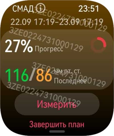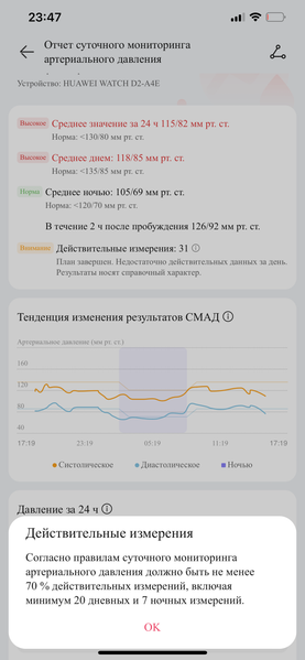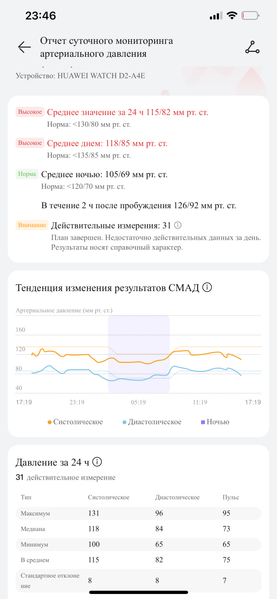 Как и раньше, погрешность измерения составляет ±3 мм рт. ст. — как у обычного медицинского тонометра. Так что в принципе вместо часов можно использовать и этот медицинский прибор — при условии, что вы правильно выбрали манжету и настроили толщину ремешка. Однако с помощью простого бытового тонометра невозможно организовать суточный мониторинг артериального давления (СМАД). И как раз это — главная уникальная функция второго поколения Huawei Watch D.