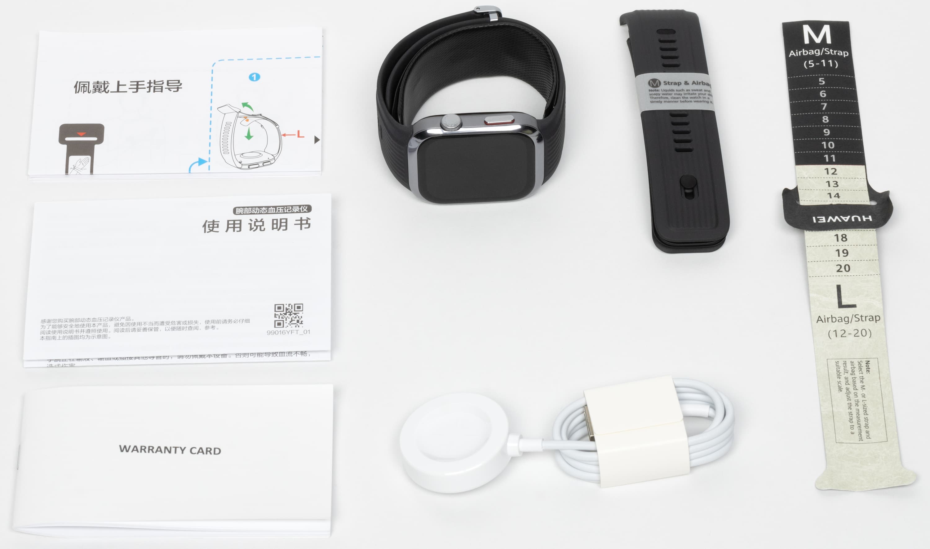 Комплектация аналогична той, что была у Huawei Watch D, но существенно отличается от привычной для умных часов. Главное здесь — две манжеты (одна присоединена к часам, другая — отдельно), половинка ремешка альтернативной длины и бумажный измеритель, который нужен, чтобы определить, какую именно манжету использовать. Кроме этого, в коробке располагается маленький буклет с условиями гарантии, раскладная листовка-руководство пользователя и отдельная листовка с разъяснениями, как прикреплять манжету к ремешку и к часам (всё это очень неочевидно), а также, разумеется, беспроводная зарядка с USB-А на конце провода. Зарядка точно такая же, как у прошлой модели и у всех других умных часов производителя.