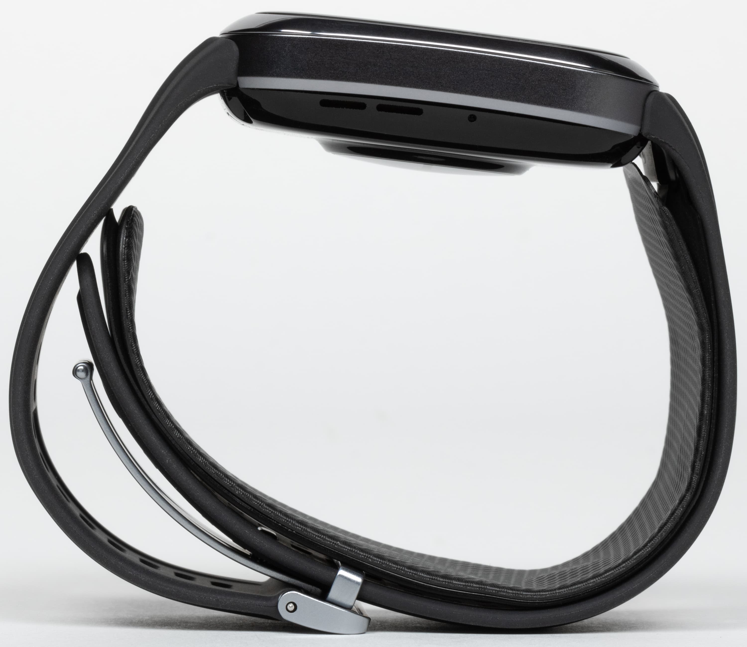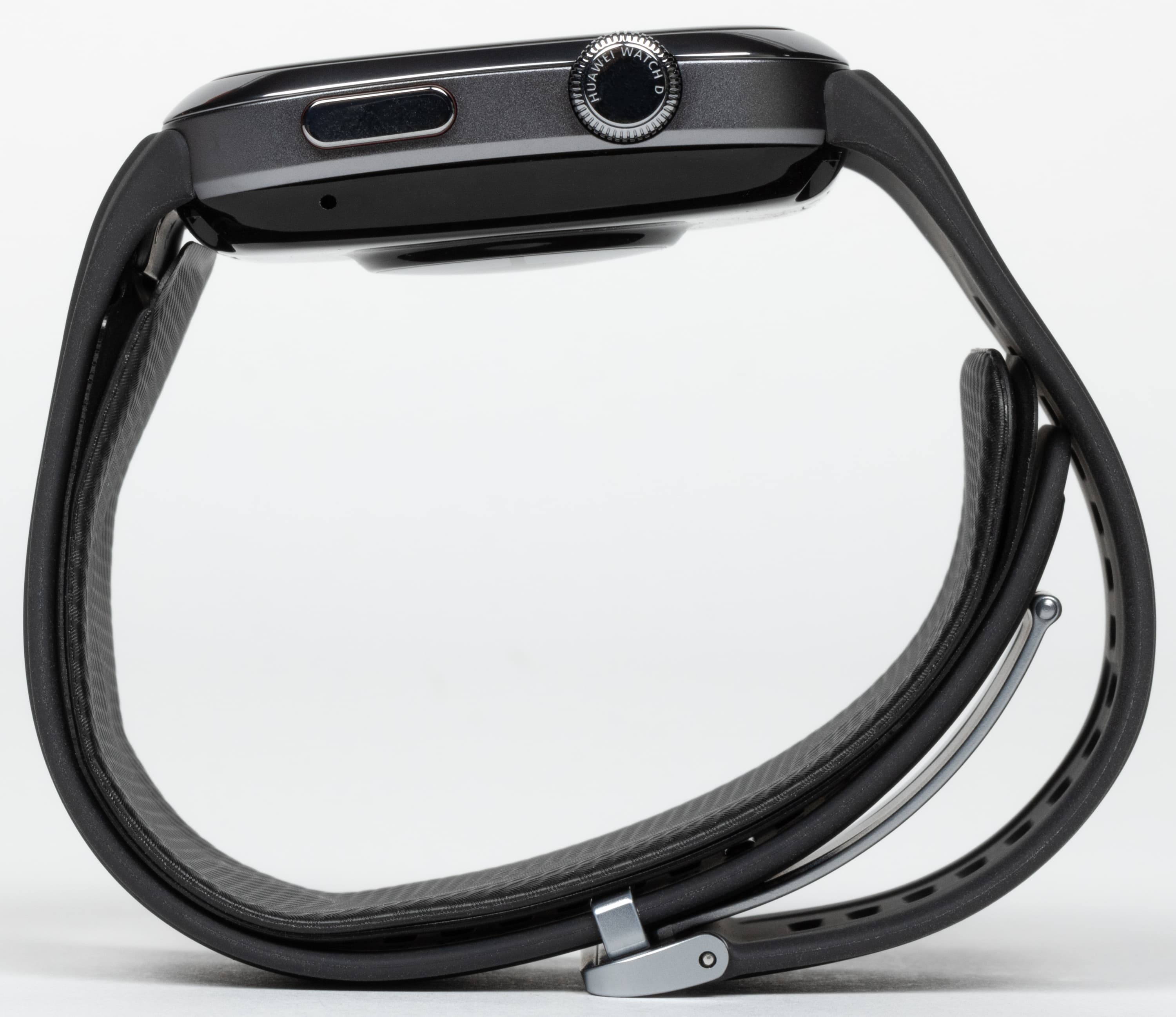 На другой грани нет никаких кнопок и слотов, но есть несколько отверстий. В обзоре Huawei Watch D мы отмечали, что поскольку микрофона и динамика там нет, отверстия нужны для забора воздуха. Теперь же появились и микрофон, и динамик (и это большой шаг вперед), так что отверстий стало больше. Добавим, что качество звука при телефонном разговоре весьма приличное, а его громкость можно регулировать колесиком.