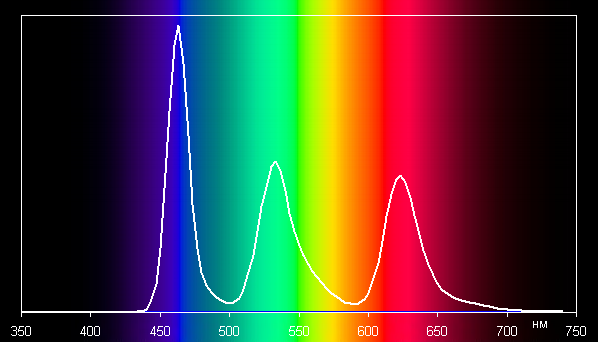 Спектры типичны для OLED — области первичных цветов хорошо разделены и имеют вид относительно узких пиков: