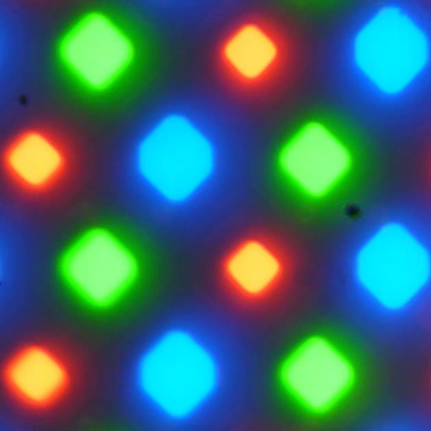 В этом экране используется OLED-матрица — активная матрица на органических светодиодах. Полноцветное изображение создается с помощью субпикселей трех цветов — красного (R), зеленого (G) и синего (B) в равном количестве, что подтверждается фрагментом микрофотографии: