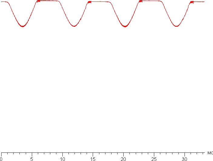 На графике зависимости яркости от времени определяется значимая модуляция с частотой 120 Гц, а при желании на некоторых изображениях при быстром движении часов относительно глаз можно выявить стробоскопический эффект. Однако по факту при обычном использовании мерцание не обнаруживается, так как скважность невысокая и фаза модуляции различается по площади экрана. На рисунке ниже приведены зависимости яркости (вертикальная ось) от времени (горизонтальная ось) для максимального значения яркости: