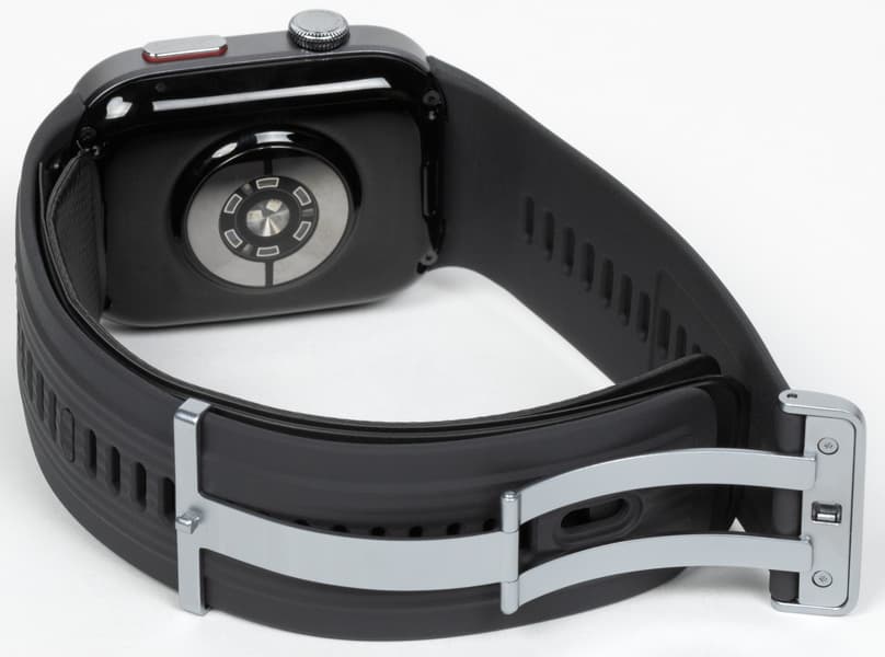 Манжета присоединена к ремешку с помощью силиконовых кнопочек-заклепок, а у основания (то есть зоны, расположенной ближе всего к корпусу часов) она жестко зафиксирована металлической заклепкой на двух крошечных винтиках. К самим часам вся эта конструкция крепится с помощью двух стальных штырьков, рядом с которыми расположена миниатюрная трубка насоса. Воздух забирается из отверстий на корпусе и через эту трубку подается в манжету.