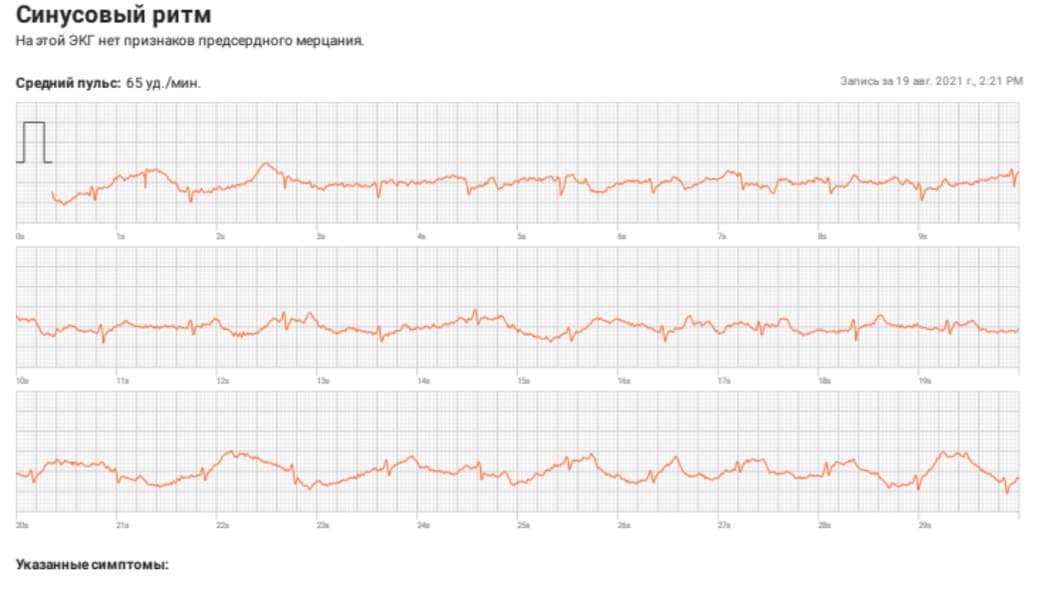 Само измерение на часах совсем недолгое — вам надо при этом сидеть по возможности неподвижно и приложить палец правой руки к продолговатой металлической кнопке. В итоге получится нечто подобное.