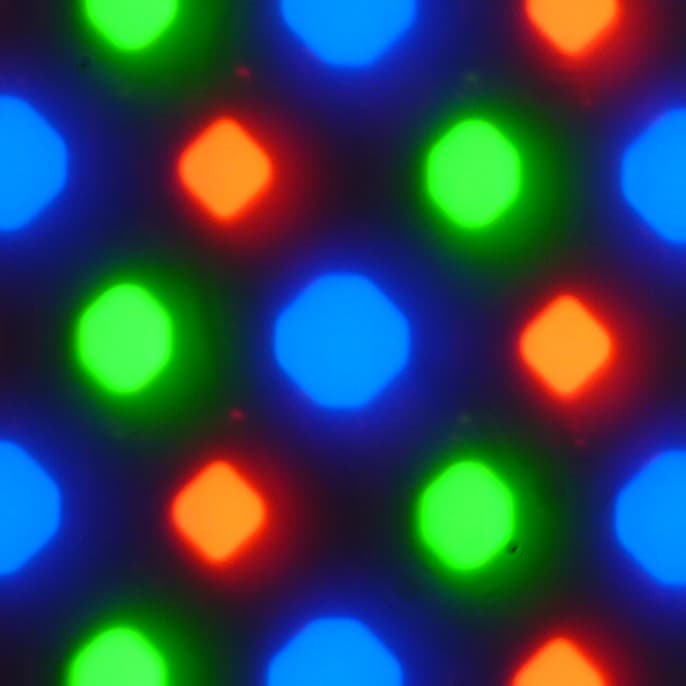В этом экране используется OLED-матрица — активная матрица на органических светодиодах. Полноцветное изображение создается с помощью субпикселей трех цветов — красного (R), зеленого (G) и синего (B) в равном количестве, что подтверждается фрагментом микрофотографии: