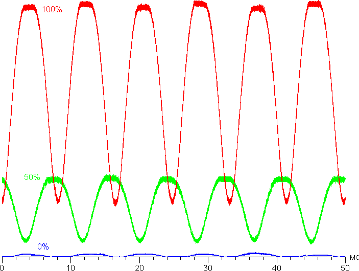 На графике зависимости яркости от времени определяется значимая модуляция с частотой 120 Гц, а при желании на некоторых изображениях при быстром движении часов относительно глаз можно выявить стробоскопический эффект. Однако по факту при обычном использовании мерцание не обнаруживается, так как фаза модуляции различается по площади экрана. На рисунке ниже приведены зависимости яркости (вертикальная ось) от времени (горизонтальная ось) для нескольких значений настройки яркости.