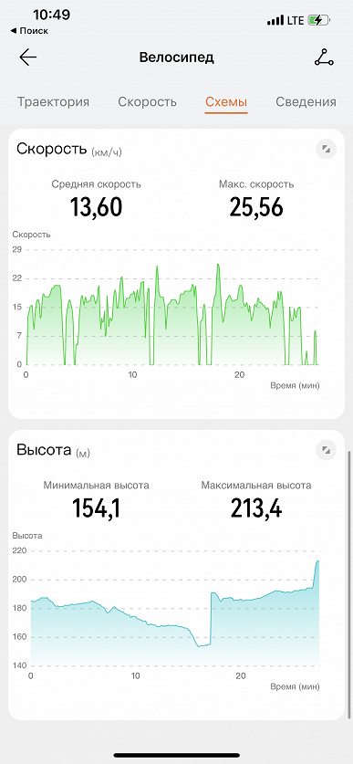 Далее, Watch GT 3 Pro — один из лучших вариантов для непрофессиональных занятий спортом. Здесь есть GPS, часы довольно точно отслеживают тренировки, в частности на свежем воздухе, и обладают полноценной влагозащитой для плавания в бассейнах/водоемах. В летний сезон это особенно актуально. Ниже — скриншоты поездки на велосипеде. Пунктирной линией обозначена пауза — в этот момент автор ехал на электричке.
