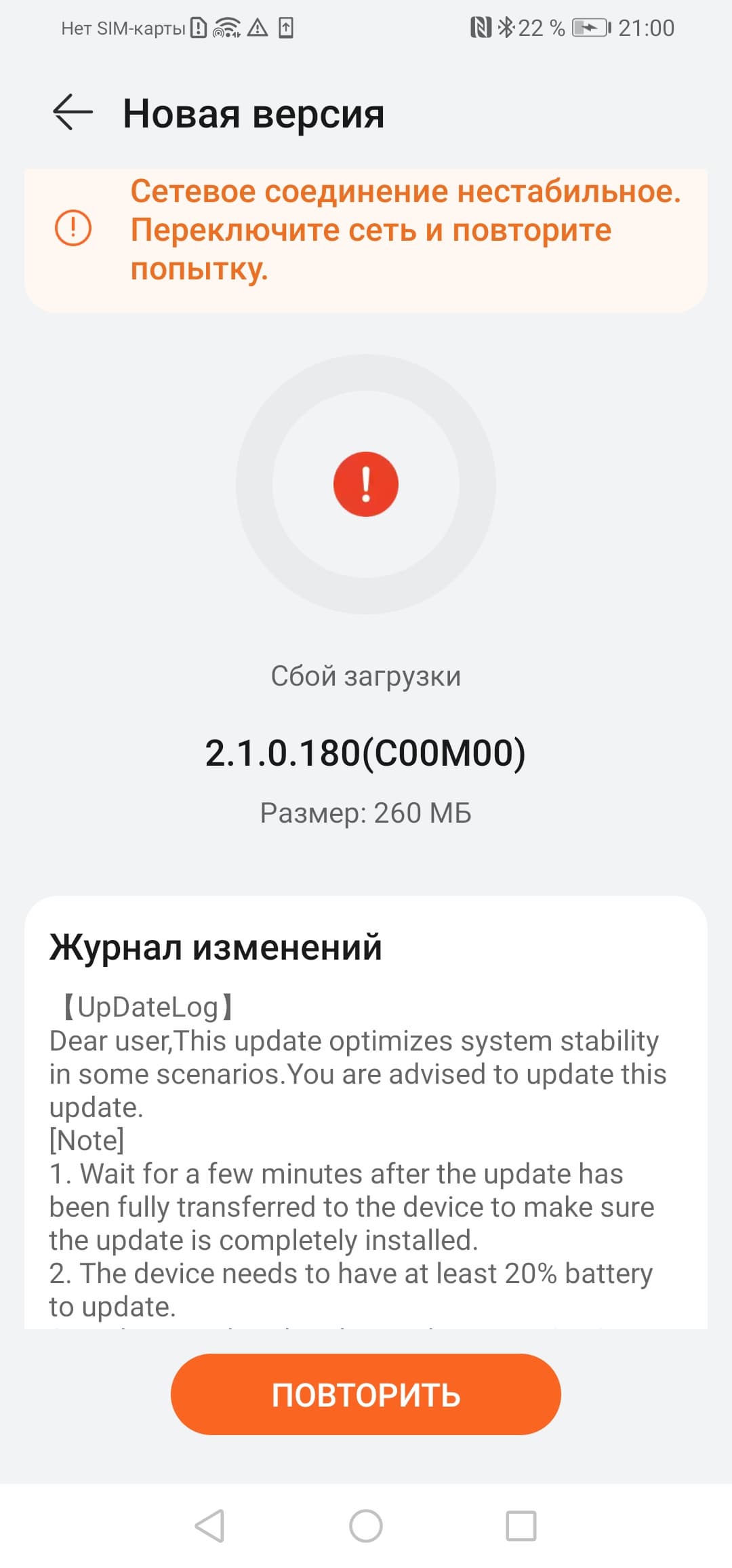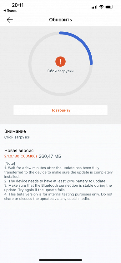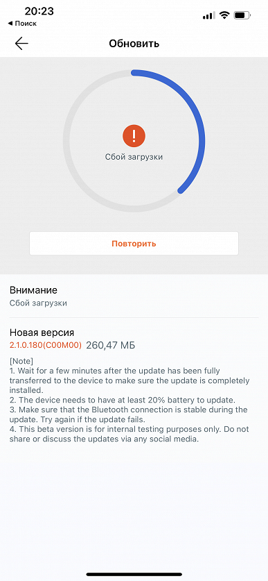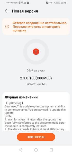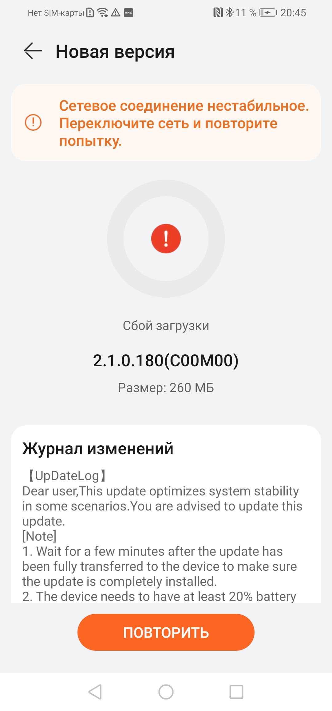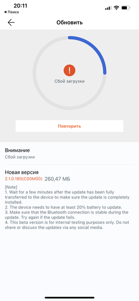 Кроме того, часы сразу предложат вам обновить ПО. Но тут мы столкнулись с неожиданной проблемой: при попытке загрузки обновления неизменно происходила ошибка. Причем, на разных стадиях. Иногда — почти сразу, а иногда загрузка доходила почти до половины и сбивалась уже там.