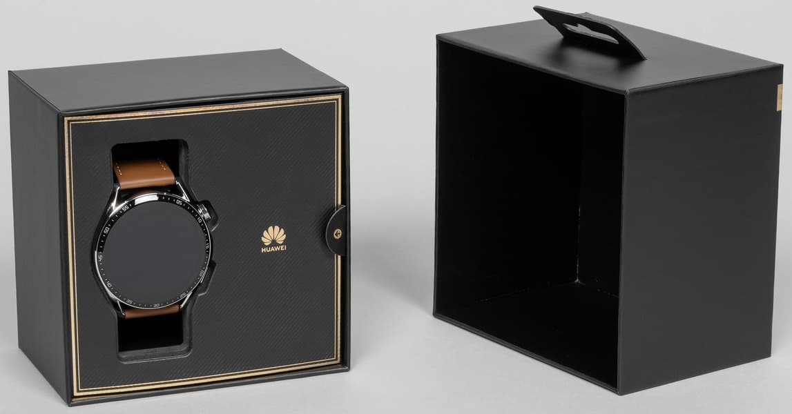Внутри коробки часы располагаются в картонной прорези, и поскольку со всех сторон они надежно защищены, риск повреждения при транспортировке минимален. Никаких отличий от более дорогих Huawei Watch 3 здесь нет. Их вообще немудрено спутать.