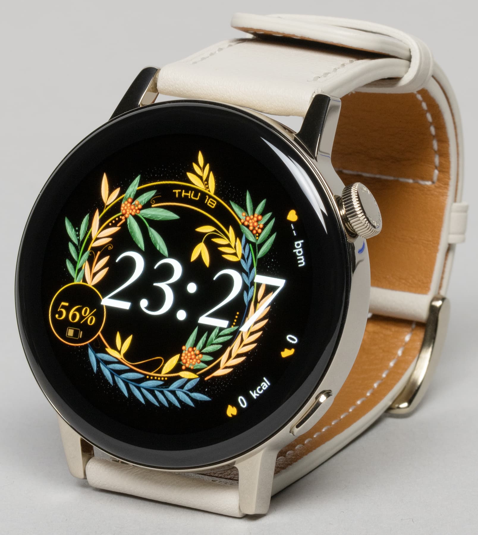 Часы доступны в единственном размере — с экраном ∅1,43″. Разрешение — 466×466, что дает 326 точек на дюйм. Дисплей полностью круглый, без мертвых зон.