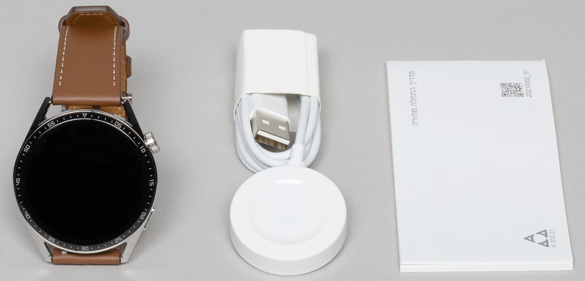 Комплектация похожая. Кроме самого устройства это только маленький буклет «Краткое руководство пользователя» и беспроводная зарядка с USB-А на конце провода. Карточки с QR-кодом для загрузки приложения Huawei Health мы не обнаружили, впрочем, не будем сильно сокрушаться по этому поводу.