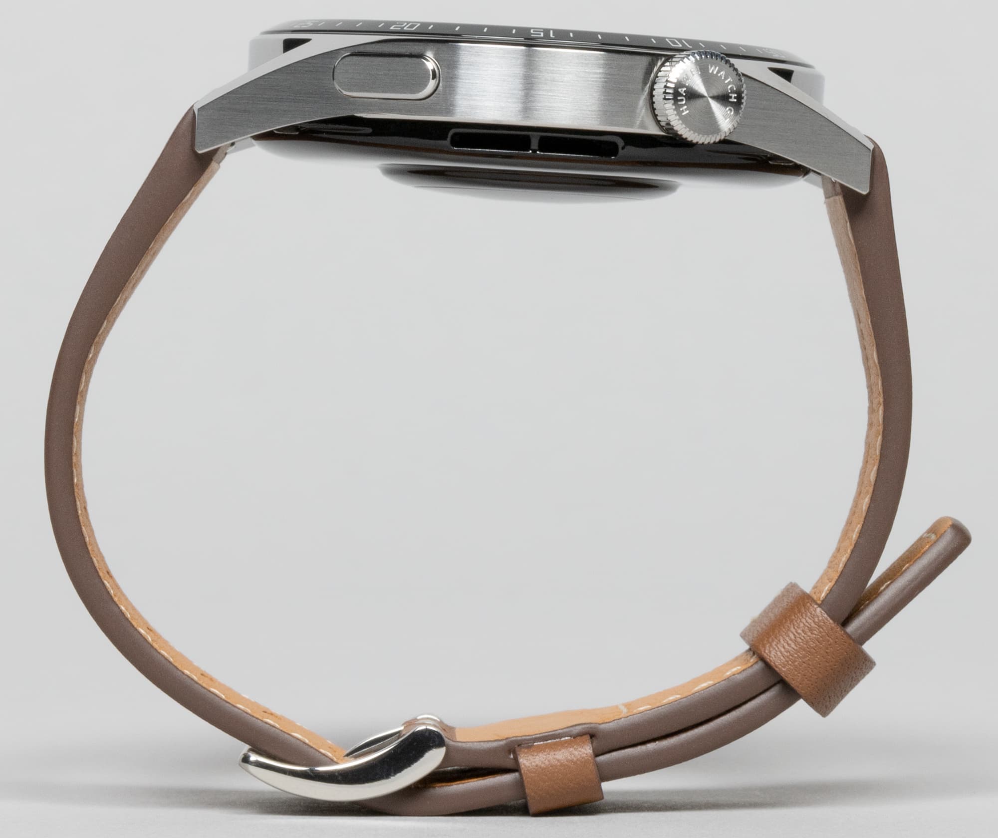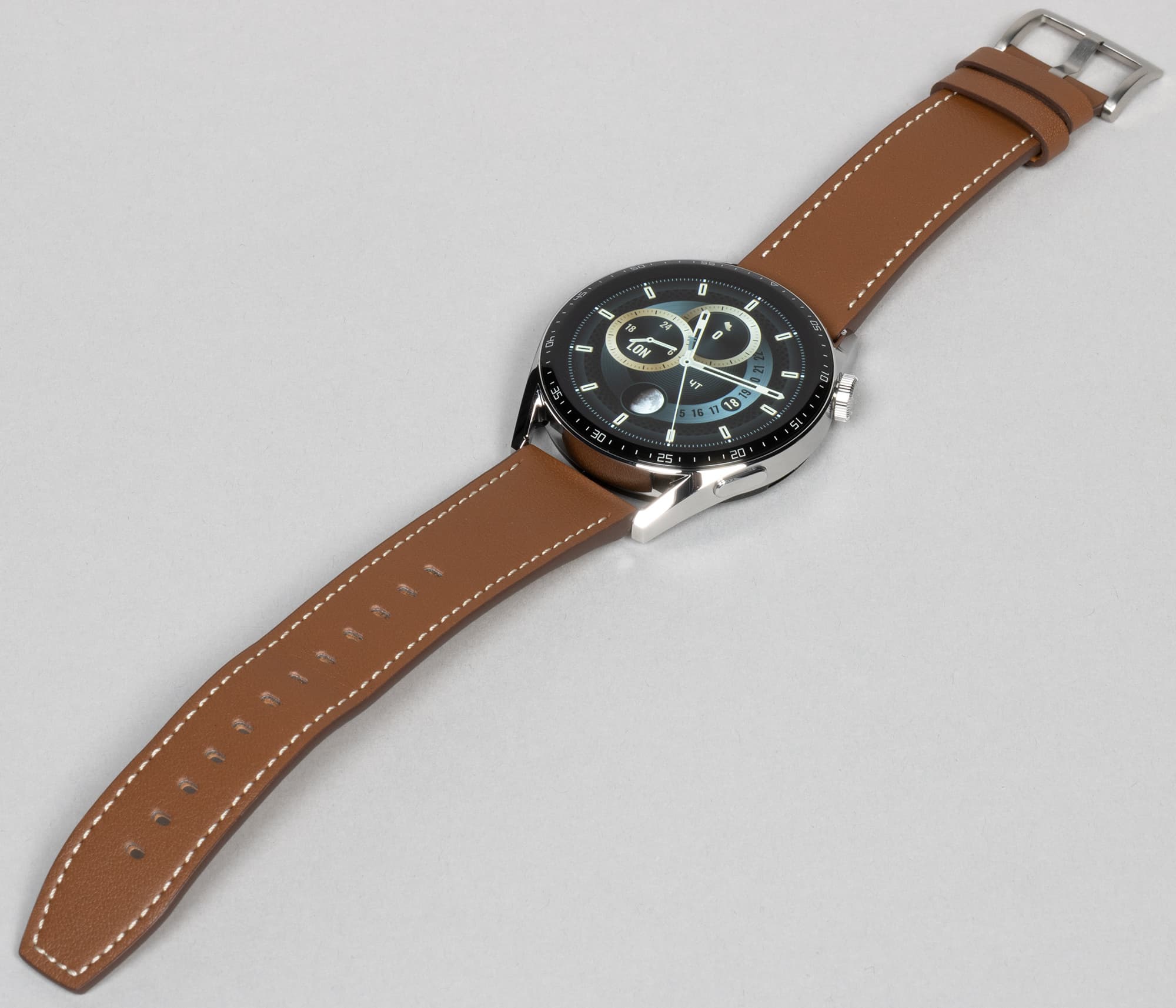 Наконец, оптимальный вариант для мужчин-ценителей делового стиля — коричневый. Размер только 46 мм, ремешок — кожаный, естественного бежевато-коричневого цвета с обеих сторон (правда, снаружи оттенок темнее), а корпус — стального цвета. Именно эту модель мы тестировали в реальной жизни. О ней дальше и пойдет речь. Добавим только, что разницы между дизайном корпуса разных версий одного размера нет, за исключением цвета. Следовательно, для черной модели будет справедливо все то, что вы ниже прочитаете о коричневой.