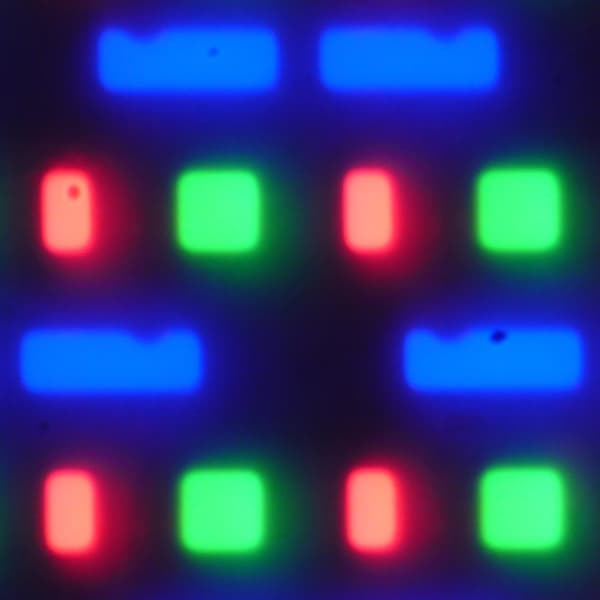 В этом экране используется OLED-матрица — активная матрица на органических светодиодах. Полноцветное изображение создается с помощью субпикселей трех цветов — красного (R), зеленого (G) и синего (B) в равном количестве, что подтверждается фрагментом микрофотографии: