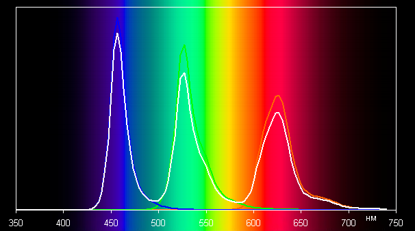 Спектры типичны для OLED — области первичных цветов хорошо разделены и имеют вид относительно узких пиков, перекрестное подмешивание цветов практически отсутствует: