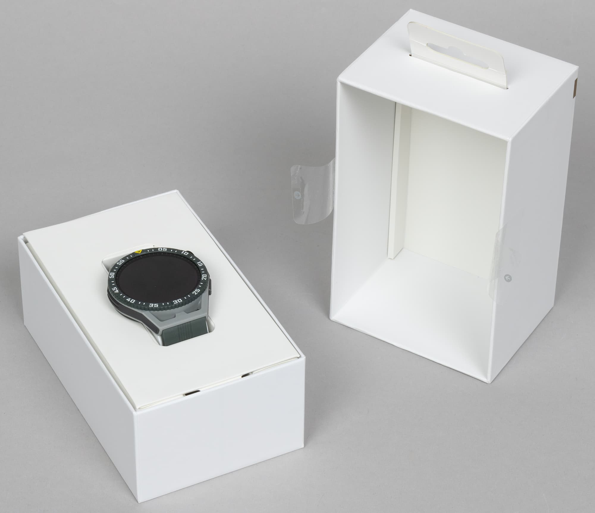 Часы поставляются в продолговатой картонной коробке, которая выглядит проще, чем у Huawei Watch GT 3 / GT 3 Pro, у которых была явная претензия на то, что это дорогие, отнюдь не бюджетные устройства.