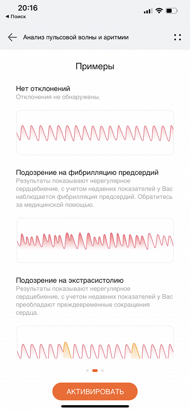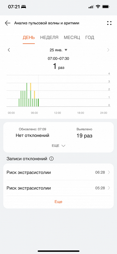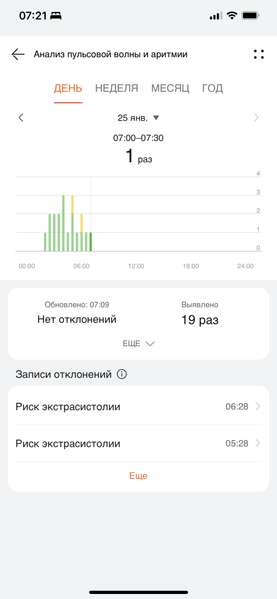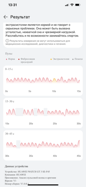 В процессе тестирования за неделю ношения часов у автора было три таких уведомления, одно из которых поступило после раннего утреннего пробуждения. По информации в самом приложении, недостаток сна, усталость и прочие факторы действительно могут стать причиной таких случаев, и это не является отклонением от нормы, а лишь сигналом, что надо немного последить за своим режимом. Можно измерить пульсовую волну и вручную — как через смартфонное приложение, так и напрямую из меню в часах. Процесс занимает 45 секунд (плюс еще около 5 секунд на подготовку).