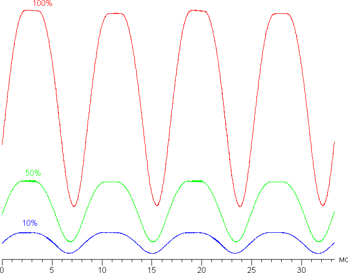 На графике зависимости яркости от времени определяется значимая модуляция с частотой 120 Гц, а при желании на некоторых изображениях при быстром движении часов относительно глаз можно выявить стробоскопических эффект. Однако по факту при обычном использовании мерцание не обнаруживается, так как фаза модуляции различается по площади экрана. На рисунке ниже приведены зависимости яркости (вертикальная ось) от времени (горизонтальная ось) для нескольких значений настройки яркости.