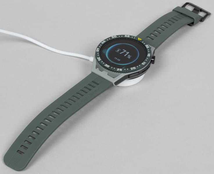 Зарядка полностью идентична Huawei Watch 3 / Watch GT 3 / Watch GT 3 Pro. На ней нет контактов, и часы можно класть на нее как угодно — спинка легко примагничивается при любой ориентации устройства. И за это, и за универсальность (внутри модельного ряда) можем только похвалить.