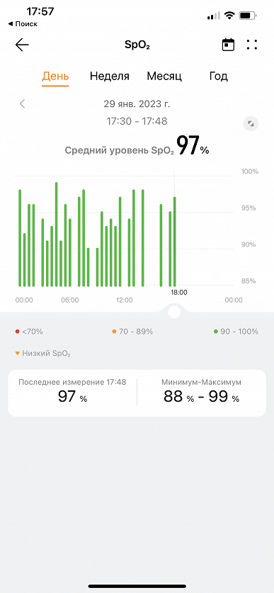 Разумеется, часы могут в фоновом режиме отслеживать и насыщенность крови кислородом (SpO2), но здесь у нас есть вопросы. Дело в том, что в норме этот показатель должен составлять 95%—98%. Всё, что ниже 95% — уже тревожный звонок. Ну а ниже 90% — это человек должен лежать на искусственной вентиляции легких. Скриншоты ниже, однако, показывают, что неоднократно в процессе измерения часы фиксировали значения ниже 90% (хотя автор при этом был вполне здоров и не страдал в обозримом прошлом никакими пневмониями. Проще говоря, точность здесь оставляет желать лучшего и всерьез полагаться на результаты (например, во время заболевания ковидом) нельзя.