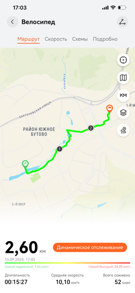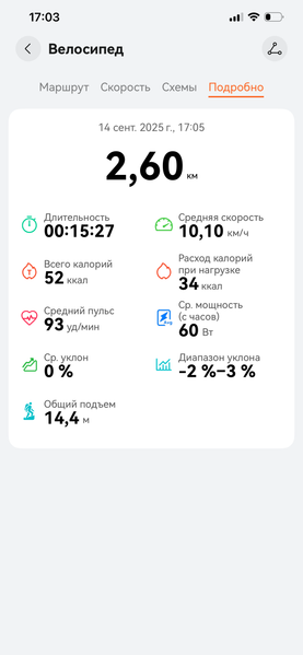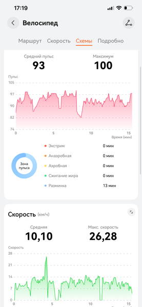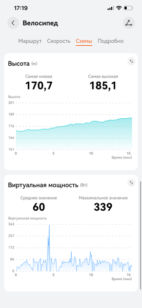 В итоговой сводке часы выводят среднее значение в ваттах, но понятно, что оно учитывает и паузы, и спуски под горку, и моменты, когда вы перестаете крутить педали. Зато если посмотреть раздел «Схемы», там будут диаграммы со всеми подробностями. На скриншоте выше видно, что в пиковый момент значение достигло 339 Вт — действительно, во время тестовой велопрогулки мы на несколько секунд максимально ускорились (насколько это было возможно в парковой зоне) — и часы точно уловили это.