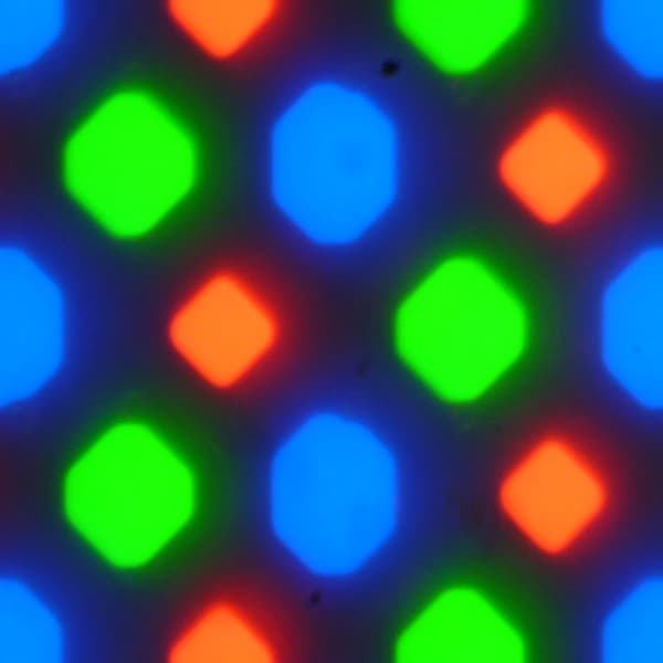 В этом экране используется OLED-матрица — активная матрица на органических светодиодах. Полноцветное изображение создается с помощью субпикселей трех цветов — красного (R), зеленого (G) и синего (B) в равном количестве, что подтверждается фрагментом микрофотографии: