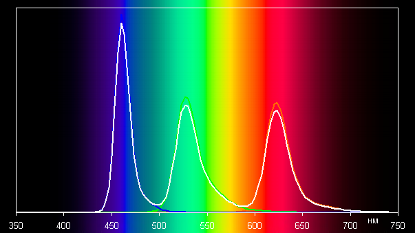 Спектры типичны для OLED — области первичных цветов хорошо разделены и имеют вид относительно узких пиков, перекрестное подмешивание цветов практически отсутствует: