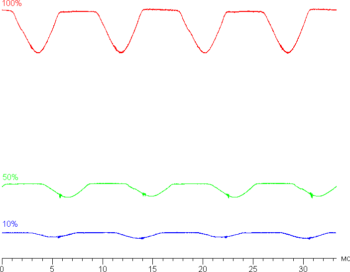 На графике зависимости яркости от времени определяется значимая модуляция с частотой 120 Гц, а при желании на некоторых изображениях при быстром движении часов относительно глаз можно выявить стробоскопический эффект. Однако по факту при обычном использовании мерцание не обнаруживается, так как фаза модуляции различается по площади экрана. На рисунке ниже приведены зависимости яркости (вертикальная ось) от времени (горизонтальная ось) для нескольких (условных) значений настройки яркости.