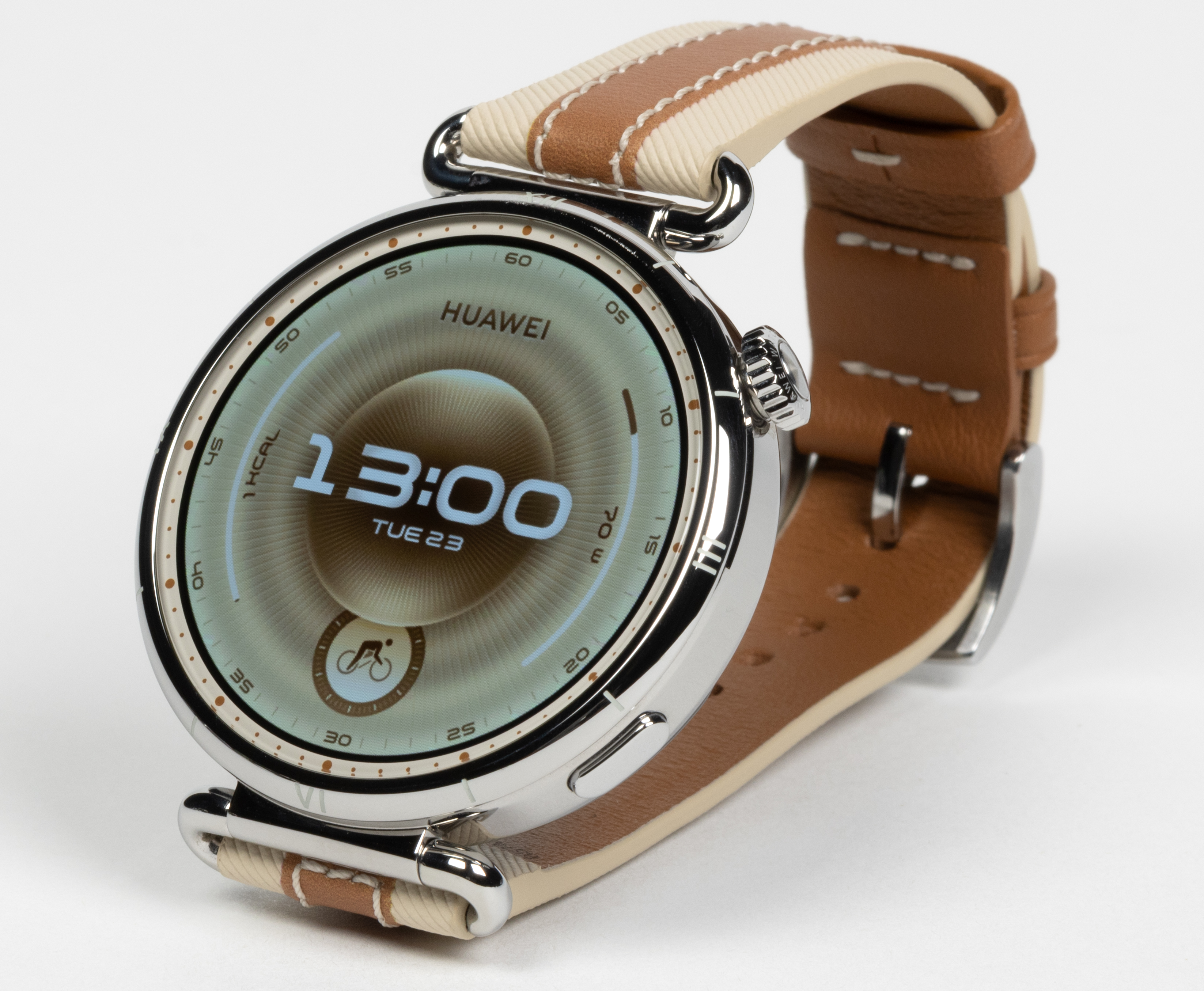 Но и фирменные ремешки нас порадовали. Вариант из фторэластомера — с волнистой поверхностью, приятный на ощупь и оптимальный для занятий спортом. Вариант из композитной кожи — с двухцветной поверхностью (светло-бежевый и коричневый) и изящной прострочкой.