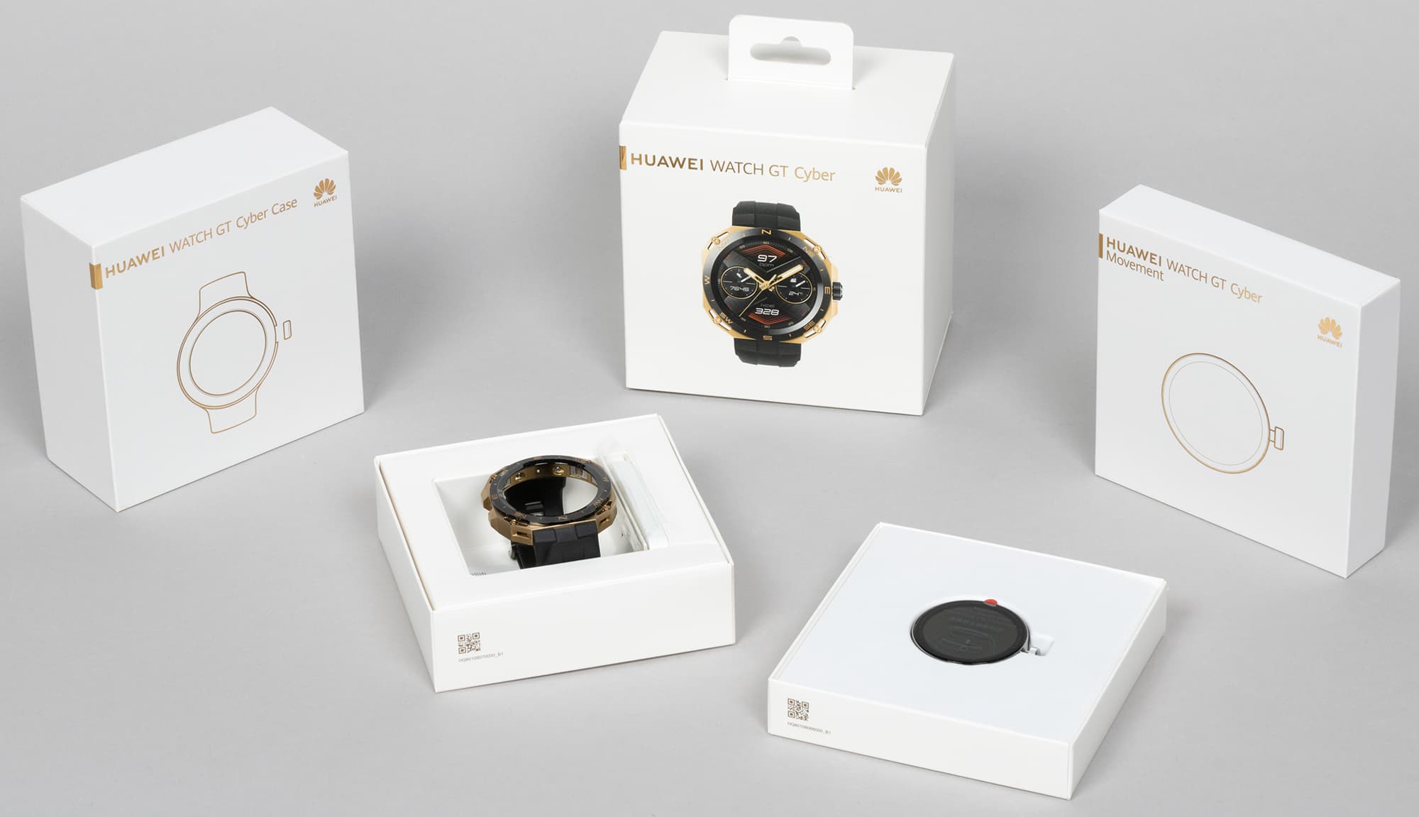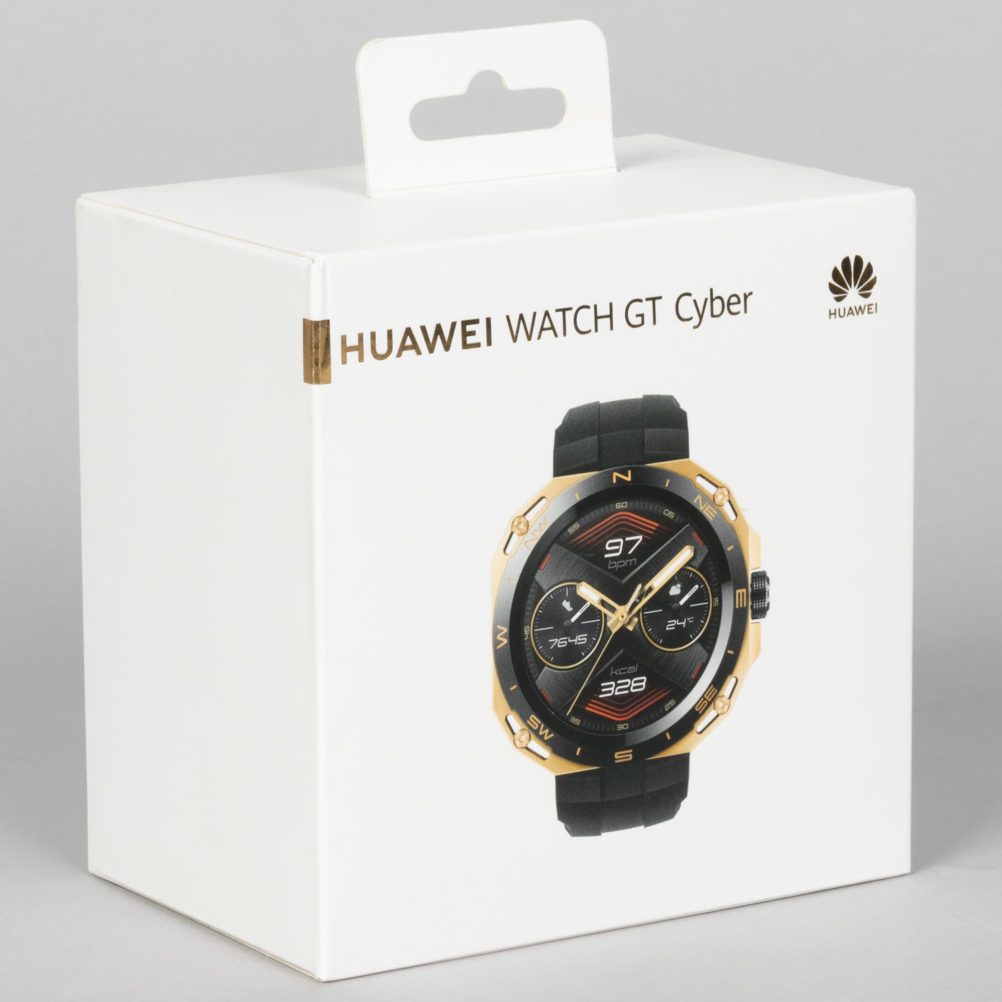 Внешне коробка Watch GT Cyber похожа на упаковку предыдущих моделей линейки Watch GT: очень плотный картонный бокс квадратной формы, умеренно минималистичный дизайн.