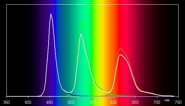Спектры типичны для OLED — области первичных цветов хорошо разделены и имеют вид относительно узких пиков, перекрестное подмешивание цветов практически отсутствует: