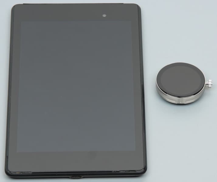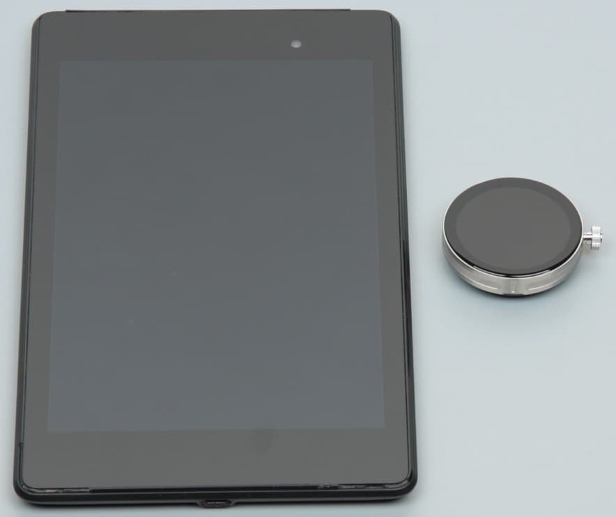 Экран у часов немного темнее (яркость по фотографиям 102 против 103 у Nexus 7). Двоение отражения слабое, это свидетельствует о том, что между слоями экрана нет воздушного промежутка. Внешняя поверхность экрана часов обладает выраженными олеофобными (жироотталкивающими) свойствами (которые заметно лучше, чем у Nexus 7), поэтому следы от пальцев удаляются существенно легче, а появляются с меньшей скоростью, чем в случае обычного стекла. Вывести произвольное изображение на экран часов можно только в виде фона циферблата, но и это позволило провести ряд тестов. При выводе белого поля и при ручной регулировке максимальное зарегистрированное нами значение яркости составило порядка 560 кд/м² (в режиме фонарика – 550 кд/м², а в автоматическом режиме на очень ярком свету больше – 620 кд/м²). С учетом отличных антибликовых свойств это позволит разглядеть изображение на экране часов в условиях сильной засветки (ясный день на улице). Минимальное значение — 10 кд/м² (и 32 кд/м² в автоматическом режиме в темноте), то есть в полной темноте яркость получится снизить до комфортного уровня. Есть и режим с автоматической регулировкой яркости по датчику освещенности с настраиваемым уровнем яркости в текущих условиях. Согласно субъективным оценкам этот режим работает адекватно, правда, яркость понижается, только после отключения экрана и включения его снова.