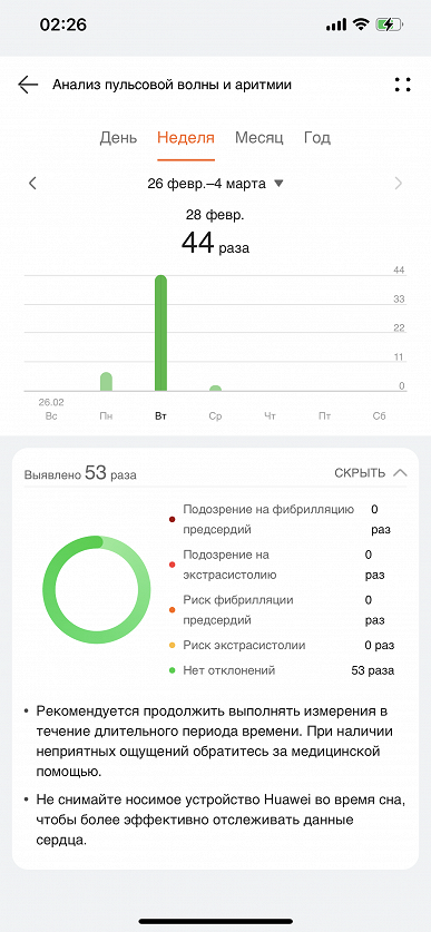 Зато здесь есть анализ пульсовой волны, о котором мы говорили в связи с Huawei Watch GT 3 SE. Напомним, при активации этого режима часы автоматически фиксируют сердцебиение и определяют, нет ли признаков аритмии (в частности — экстрасистолии, то есть нарушения сердечного ритма, характеризующегося внеочередными сокращениями всего сердца или его отдельных частей). В случае обнаружения внеочередных сокращений часы посылают уведомление о риске экстрасистолии, а в приложении затем можно посмотреть, когда именно они наблюдались.