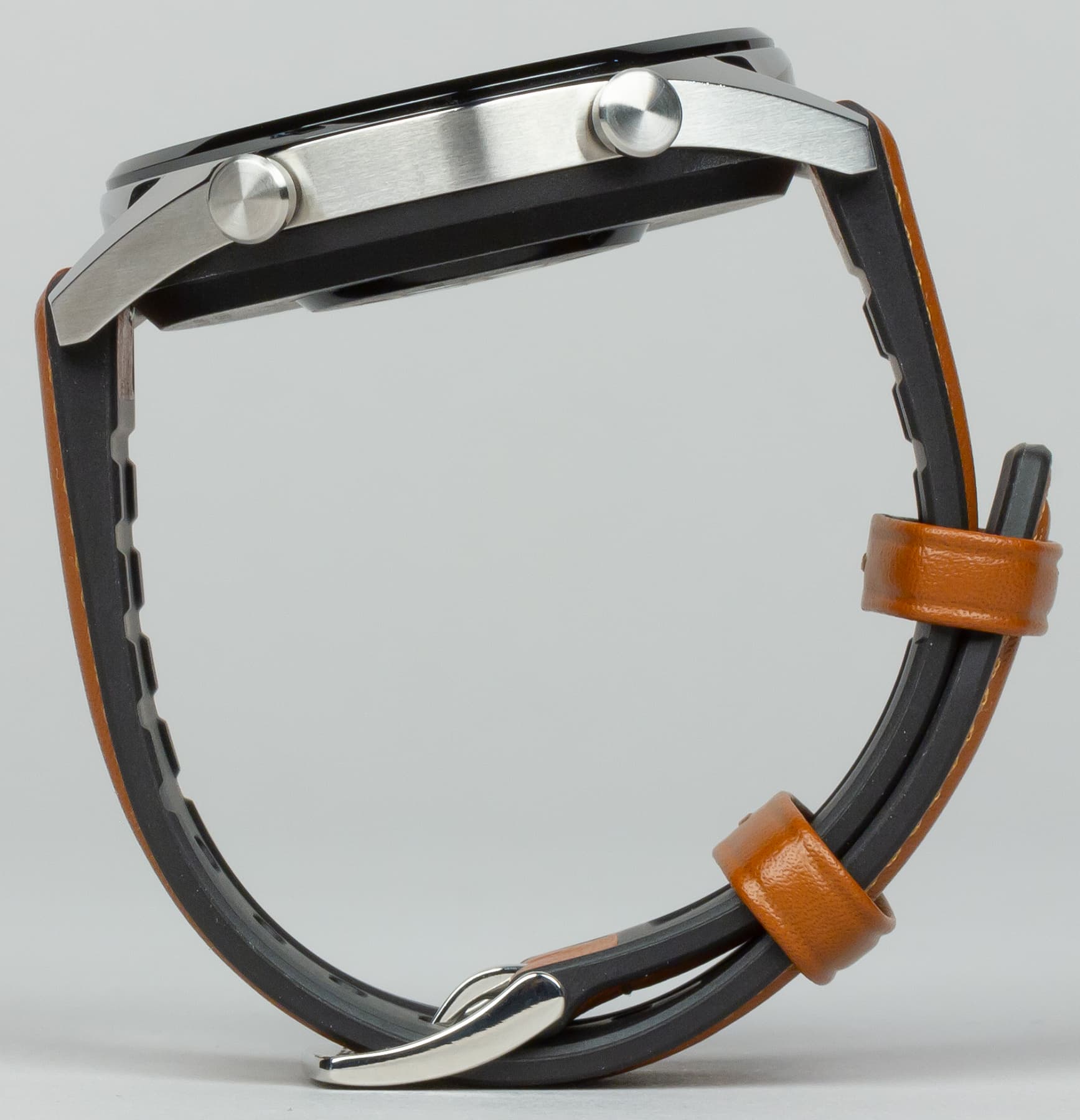 Плюс в том, что такой ремешок меньше засаливается и проще очищается от пота и грязи. Главная беда полностью кожаных ремешков — в том, что они довольно быстро теряют новый вид, а здесь такой проблемы явно не будет. Минус же в том, что ощущения от прикосновения силикона к руке все же иные, чем от кожи. Тут уж дело вкуса, но кожа — приятнее.