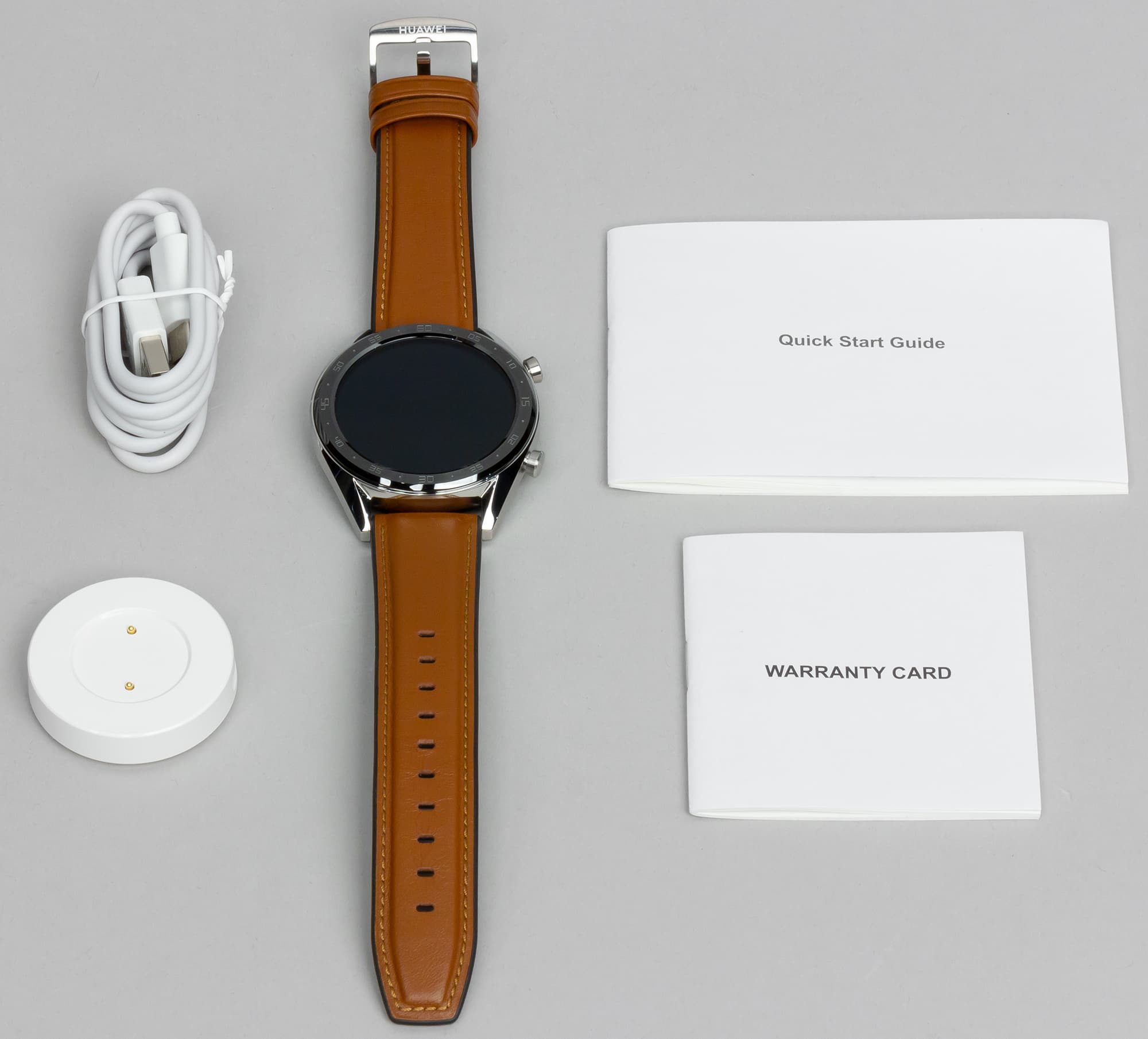 Комплектация при этом довольно скромная: внутри бокса мы обнаружили, помимо часов, гарантийный буклет, краткое руководство пользователя (полезная информация на английском языке там помещается на одной страничке), зарядку-таблетку и кабель USB-C.