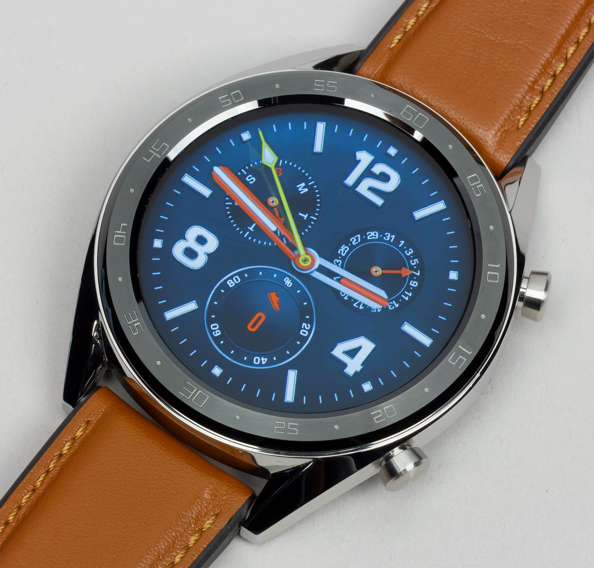 В целом, повторимся, дизайн часов производит очень приятное впечатление. Несмотря на немалый размер экрана, модель не выглядит громоздкой. А металлический безель с физическими цифрами и стальной корпус придают устройству солидности. Гармонирует с ними и ремешок, внешне полностью кожаный, а на самом деле двухслойный.
