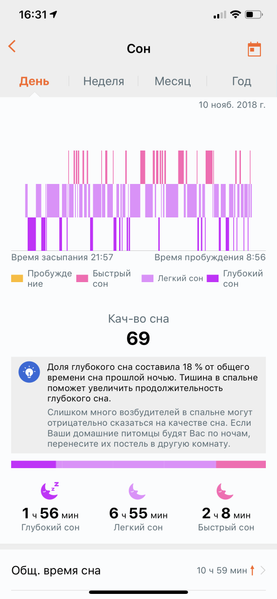 Отметим, что здесь нет функции умного будильника (то есть подачи сигнала в определенный интервал времени для пробуждения в правильной фазе сна). Зато вся статистика по сну собирается очень точно. Часы не путают кратковременные пробуждения с прекращением сна, например. И наоборот, простое лежание в постели не считают сном. Правда, стоит оговориться, что часы могут фиксировать только сон длиннее трех часов. Так что любителям сиесты (точнее, тем счастливцам, у которых есть такая возможность :)) не удастся зафиксировать свой дневной отдых.