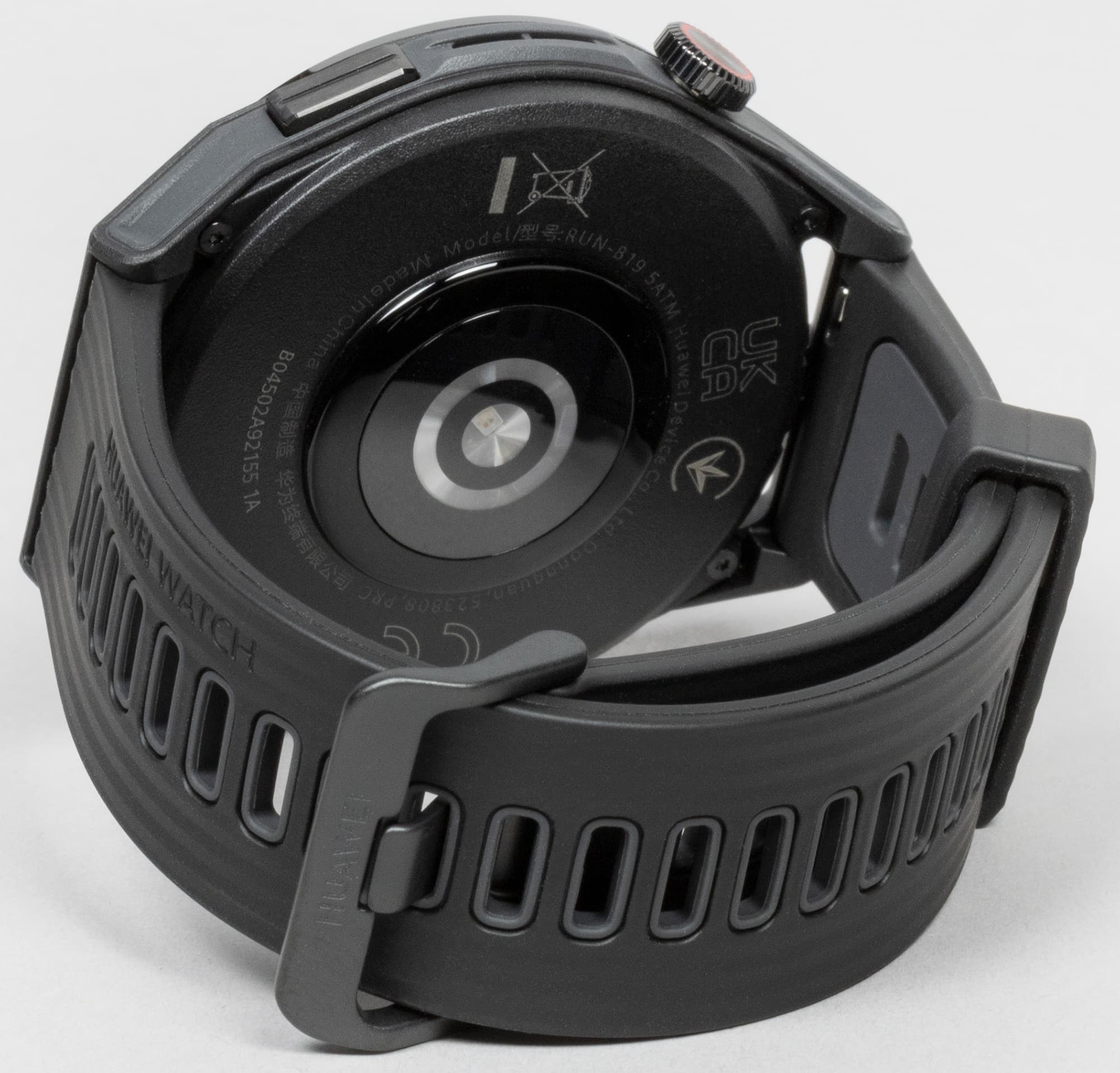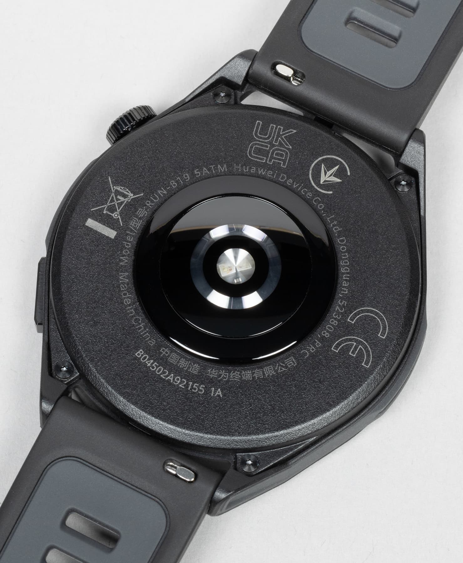 На тыльной поверхности расположены оптические датчики, и внешне это выглядит точно так же, как у Watch 3 и Watch GT 3, но функциональная разница в том, что в Runner отсутствует датчик температуры поверхности кожи. Честно говоря, мы не будем особенно горевать по этому поводу: к самой этой опции множество вопросов, и в текущей своей реализации она, на наш взгляд, бесполезна.