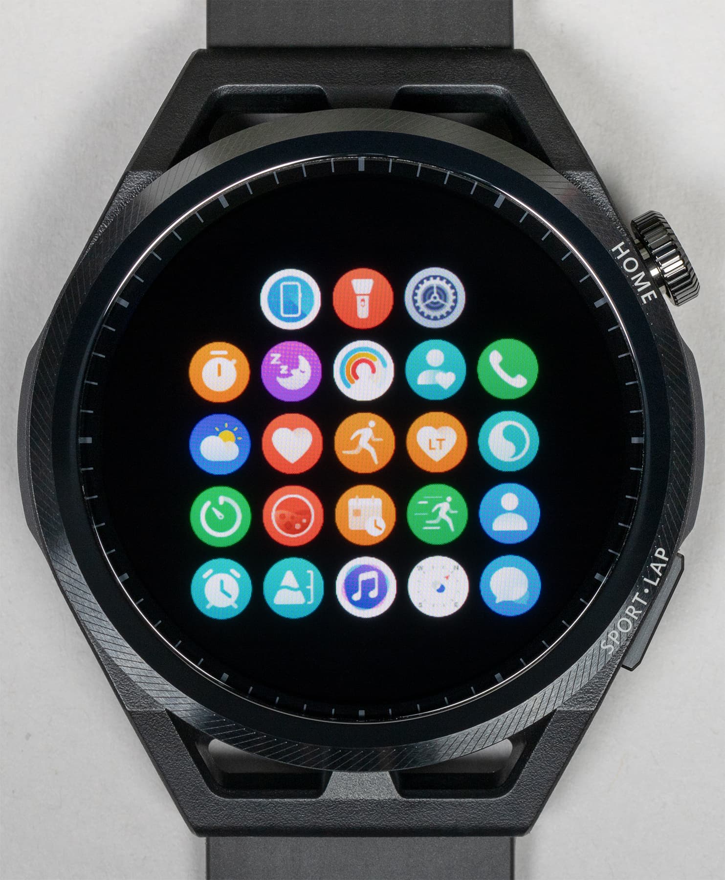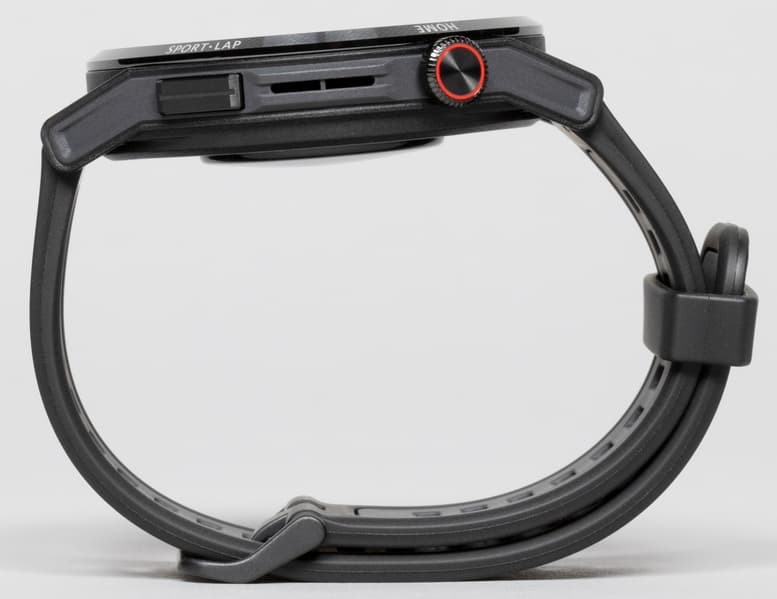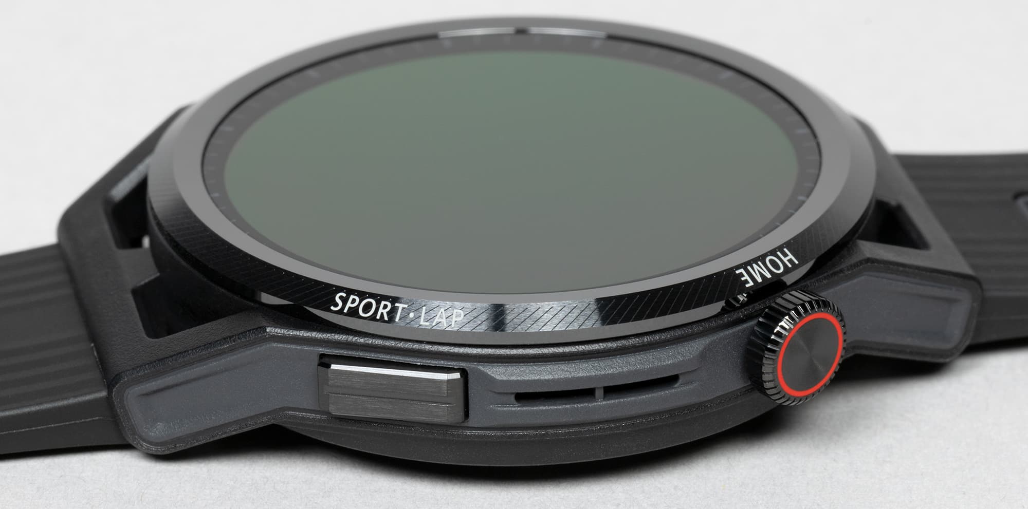 Второй момент: на безеле напротив кнопок выгравированы слова Sport·Lap и Home. Следовательно, нижняя кнопка используется для попадания в меню тренировок и управления беговыми тренировками. А верхнее колесико — для попадания в главное меню приложений и возврата на стартовый экран (циферблат). Добавим, что колесико это вращается, как и в старших моделях линейки. Выполнено оно из титанового сплава.