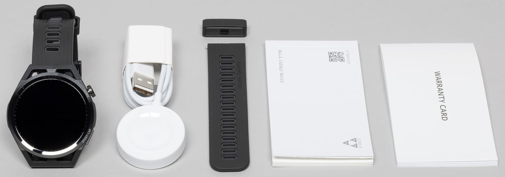 Главная особенность комплектации и отличие от того, что мы видели в коробке Huawei Watch GT 3 — это дополнительная половинка ремешка альтернативного размера. Также имеется маленький буклет «Краткое руководство пользователя», гарантийный талон и беспроводная зарядка с USB-А на конце провода.