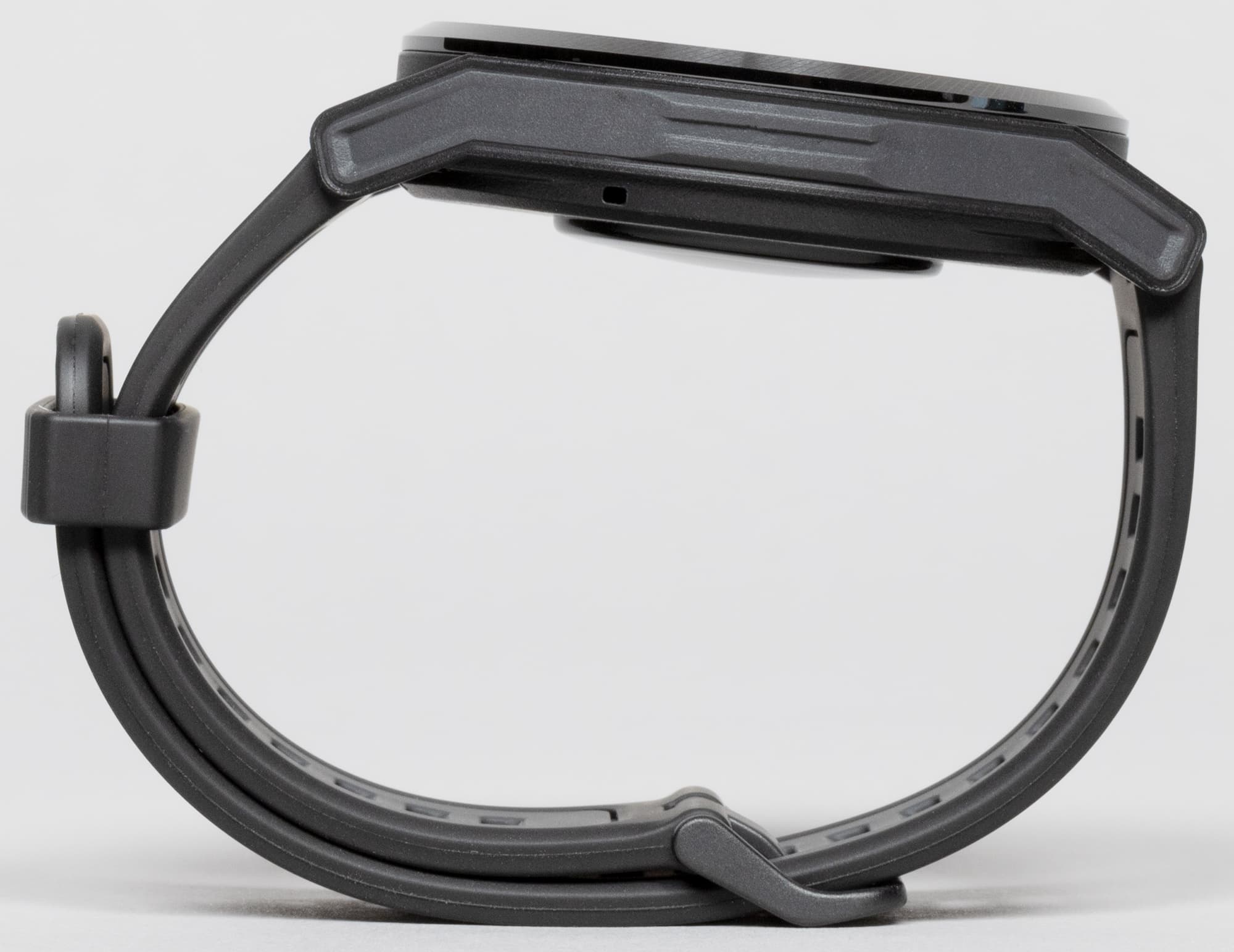 Крепление половинок ремешка стандартное, на спицах с рычажками. Ширина — тоже стандартная, 22 мм, так что нет никаких проблем купить альтернативный вариант ремешка. Впрочем, комплектный вполне соответствует позиционированию часов: это качественный, очень гибкий силикон со множеством прорезей. Типичный спортивный стиль здесь соединяется с возможностью приспособить часы к запястью любой толщины.