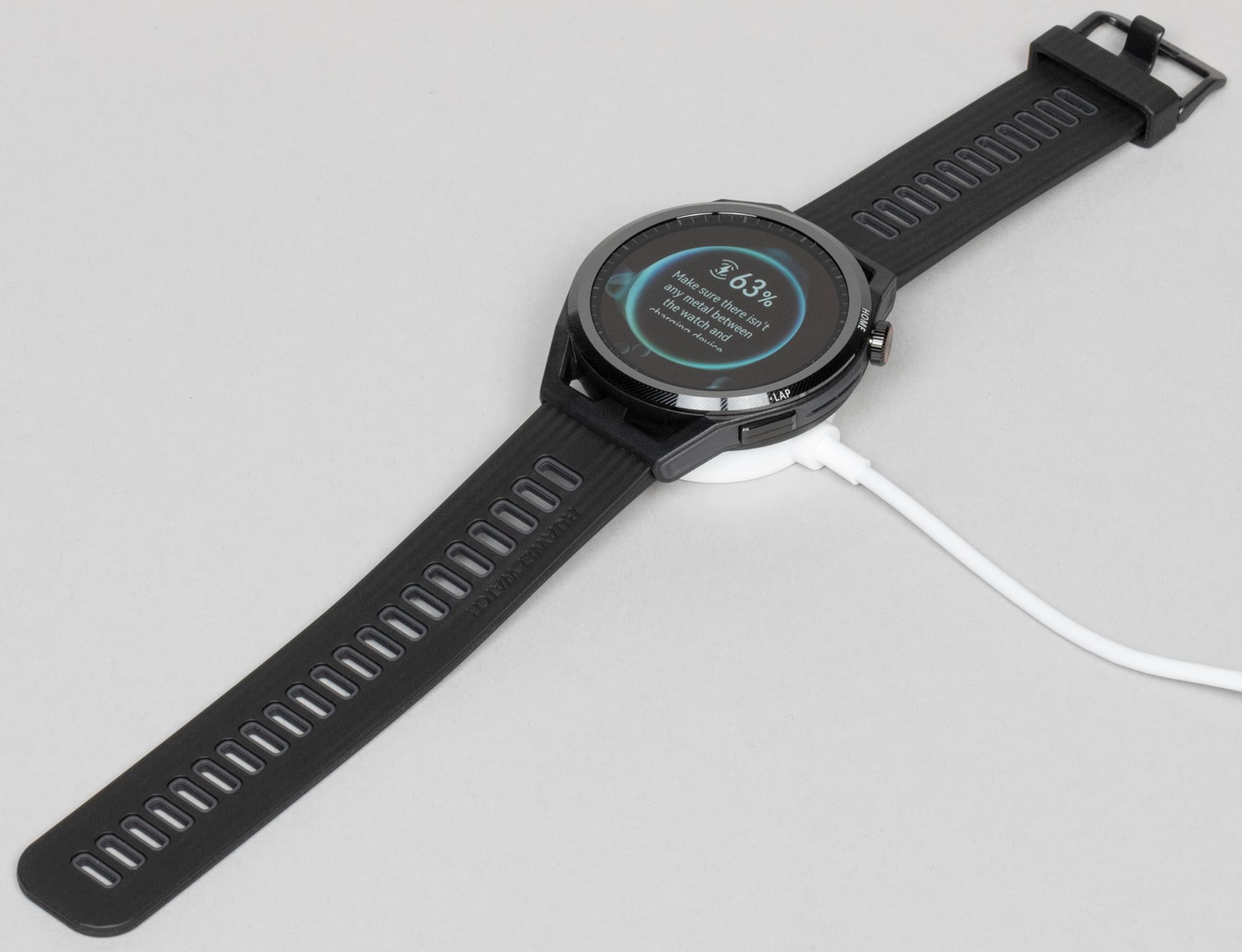 Зарядка полностью идентична Huawei Watch 3 и Watch GT 3. Мы уже отмечали, что она более удобна, чем у многих других умных часов, поскольку на ней нет контактов и часы можно класть на нее как угодно — спинка гаджета легко примагничивается при любой ориентации устройства. Можем только повторить это соображение.