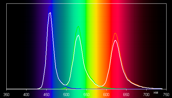 Спектры типичны для OLED — области первичных цветов хорошо разделены и имеют вид относительно узких пиков, перекрестное подмешивание цветов практически отсутствует: