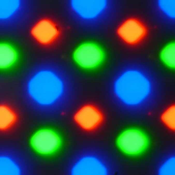 В этом экране используется OLED-матрица — активная матрица на органических светодиодах. Полноцветное изображение создается с помощью субпикселей трех цветов — красного (R), зеленого (G) и синего (B) в равном количестве, что подтверждается фрагментом микрофотографии: