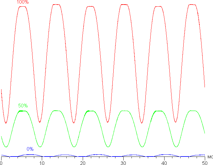 На графике зависимости яркости от времени определяется значимая модуляция с частотой 120 Гц, а при желании на некоторых изображениях при быстром движении часов относительно глаз можно выявить стробоскопических эффект. Однако по факту при обычном использовании мерцание не обнаруживается, так как фаза модуляции различается по площади экрана. На рисунке ниже приведены зависимости яркости (вертикальная ось) от времени (горизонтальная ось) для нескольких значений настройки яркости.