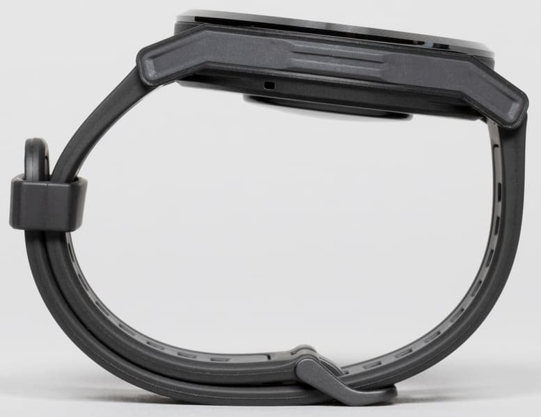 Датчики закрыты стеклом, остальная поверхность, примыкающая к руке — пластиковая. Пластиковые и грани корпуса с петлями, однако это не простой пластик, а по ощущениям нечто более прочное и плотное. Производитель сообщает: «корпус часов выполнен из износостойкого полимерного материала с керамическим покрытием».