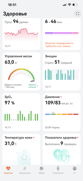 Интересно, что по сравнению с моделью 2023 года часы обеспечивают существенно меньшую автономность. Производитель обещает при типичном использовании около трех с половиной суток в связке с iPhone и около четырех с половиной — при работе со смартфоном Android/HarmonyOS. Наш опыт использования показал, что в общем-то это вполне реалистичные прогнозы, хотя мы не разговаривали через часы во время совершения телефонных звонков и лишь минимально задействовали тренировки. С другой стороны, все биометрические датчики были активированы и работали по максимуму.
