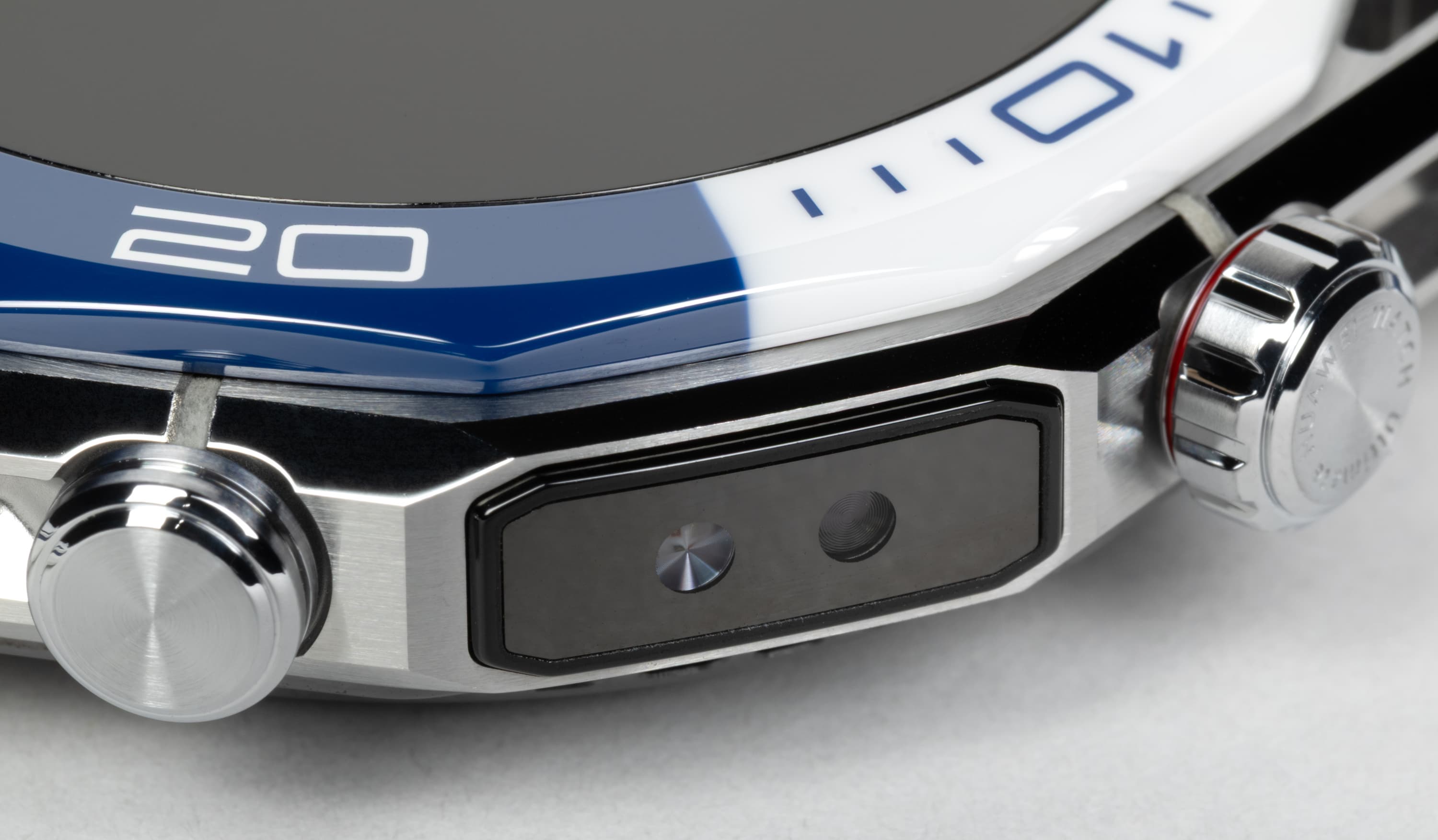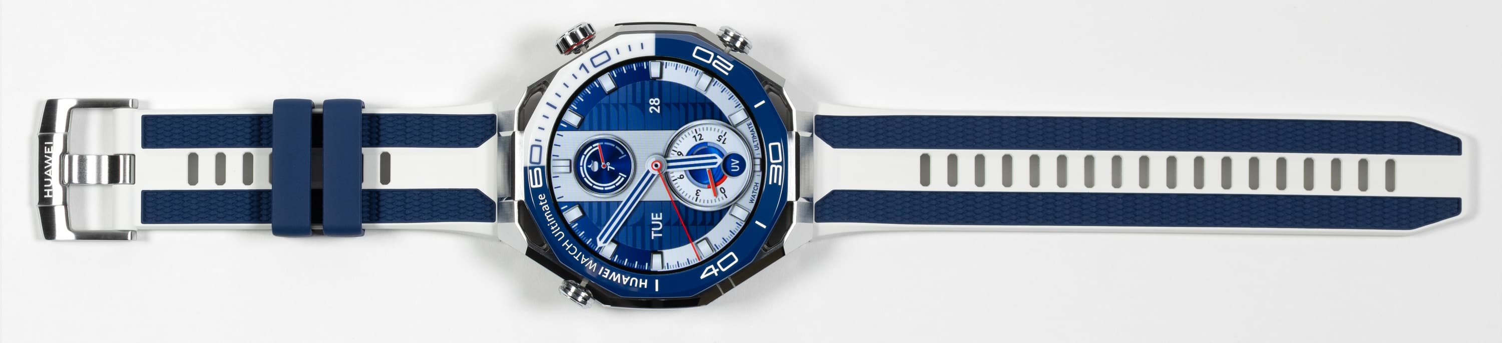 И если на синей части безеля гравировка белая, то на белой — синяя. Это, прежде всего, цифры и насечки, но также надпись «Huawei Watch Ultimate» — раньше она была вынесена на грань безеля, теперь же идет прямо по нему.